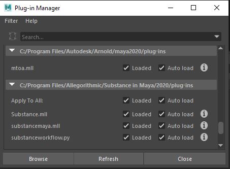 - Als erstes Substance in Maya unter Windows | Settings/Preferences > Plug-In Manager aktivieren.